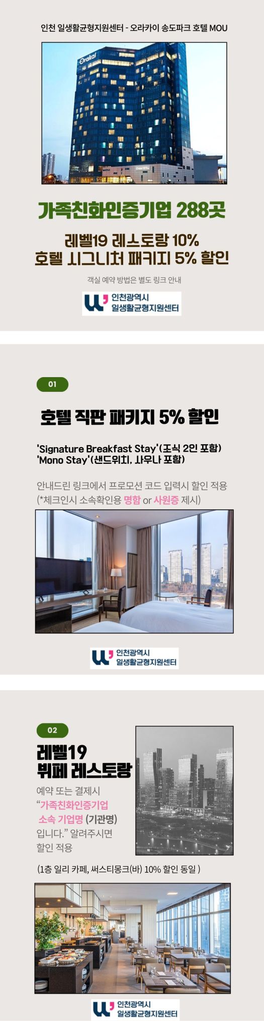 가족친화인증기업-오라카이 송도파크 호텔 패키지 5%, 레벨19 레스토랑 10% 할인